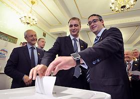Депутат Московской городской думы Евгений Герасимов (слева), председатель Московской городской думы Владимир Платонов (второй справа) и председатель Совета муниципальных образований города Москвы Алексей Шапошников (справа) во время голосования на конференции Московского городского регионального отделения партии "Единая Россия" в Центральном Доме ученых РАН.