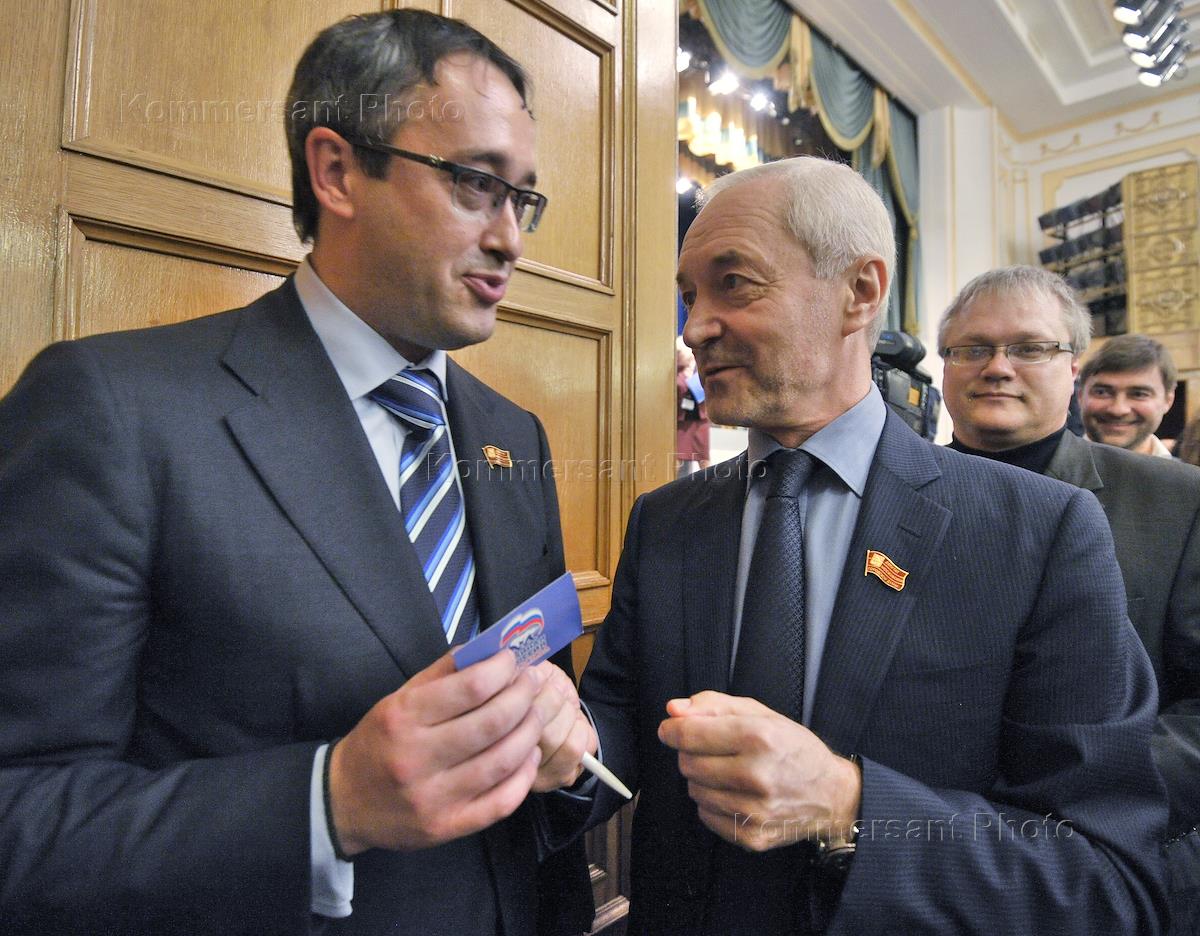 Депутат Московской городской думы Евгений Герасимов (слева) и председатель Совета муниципальных образований города Москвы Алексей Шапошников (справа) во время голосования на конференции Московского городского регионального отделения партии "Единая Россия" в Центральном Доме ученых РАН.