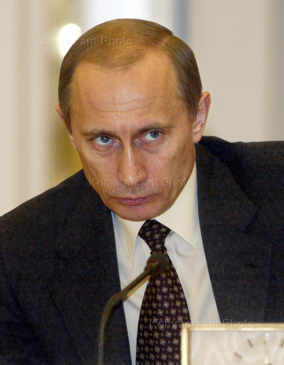 Russian President Vladimir Putin and Prime Minister Mikhail Kasyanov (half obscured behind President Putin) meet leaders of the Russian Industrialists and Entrepreneurs Association (RSPP) in the Kremlin.