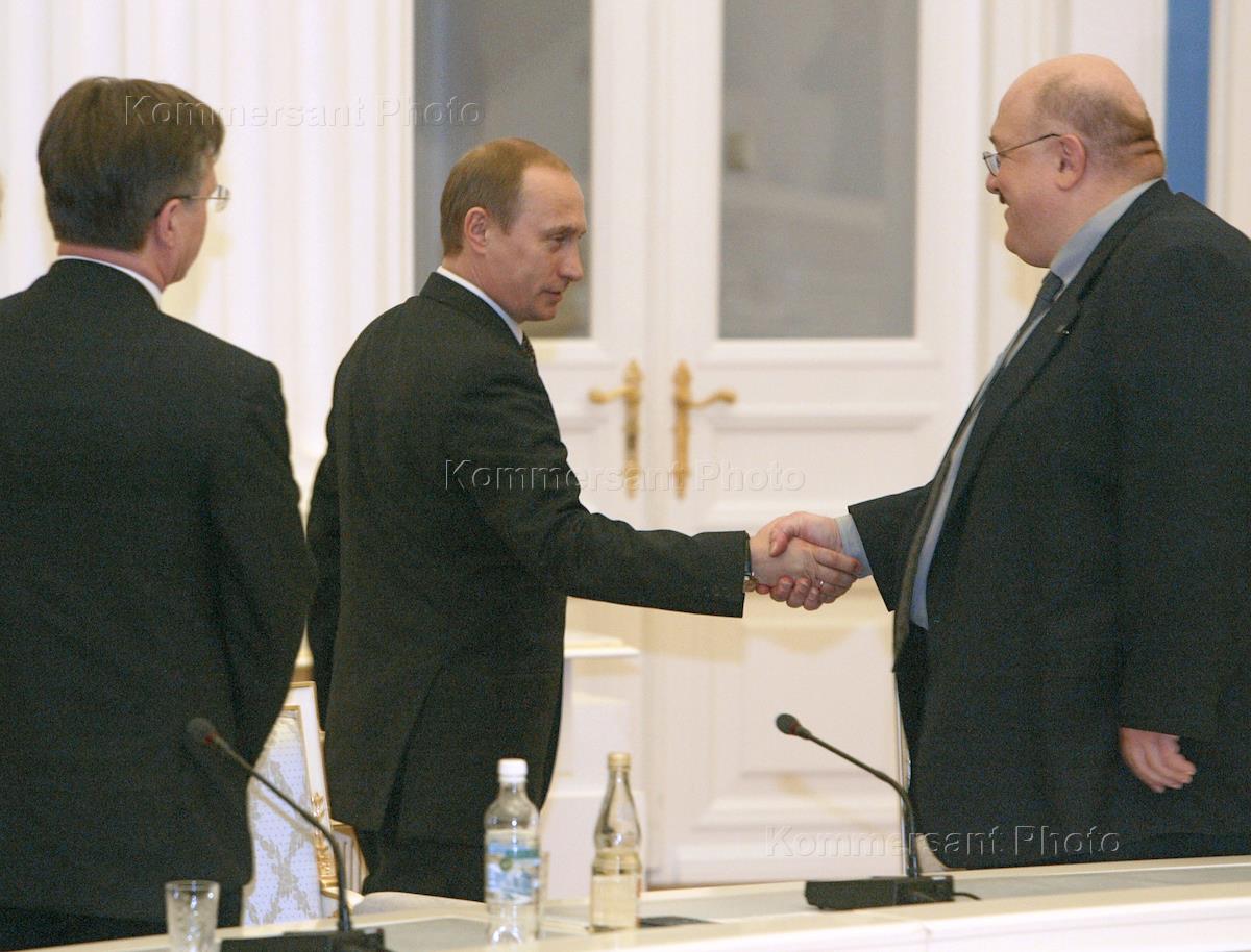 Президент России Владимир Путин (слева) и советник Президента по экономическим вопросам Андрей Илларионов (справа) во время встречи с представителями Российского союза промышленников и предпринимателей (РСПП). Встреча прошла в Кремле.