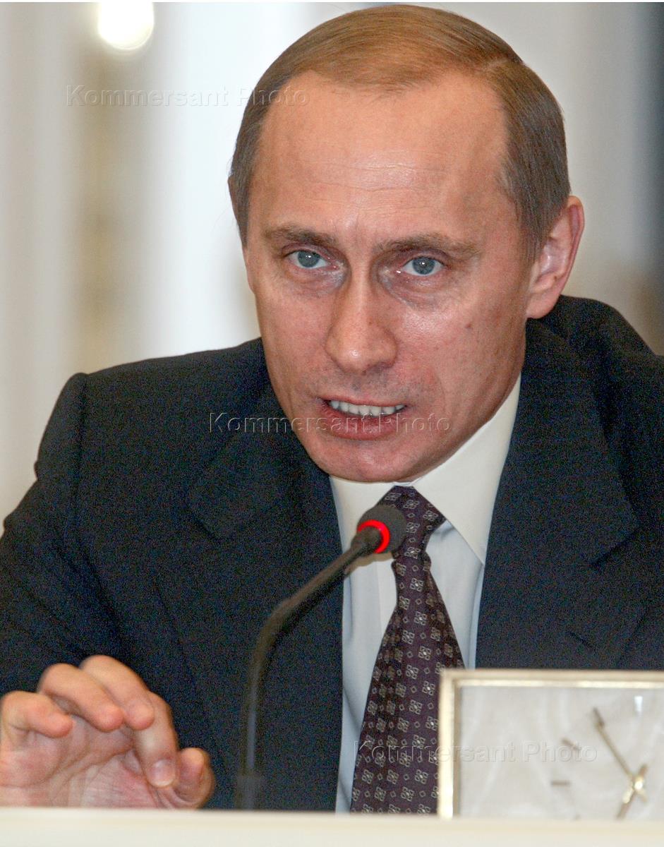 Президент России Владимир Путин (слева) и председатель Правительства России Михаил Касьянов (справа) во время встречи с представителями Российского союза промышленников и предпринимателей (РСПП). Встреча прошла в Кремле.