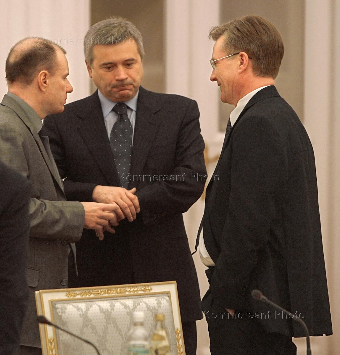 Sibneft oil company CEO Yevgeny Shvidler (left), Russian president's economic advisor Andrey Illarionov (centre), and Alfa-Bank President Mikhail Fridman have a talk before Russian President Vladimir Putin's meeting with leaders of the Russian Industrialists and Entrepreneurs Association (RSPP). The meeting was held in the Kremlin.