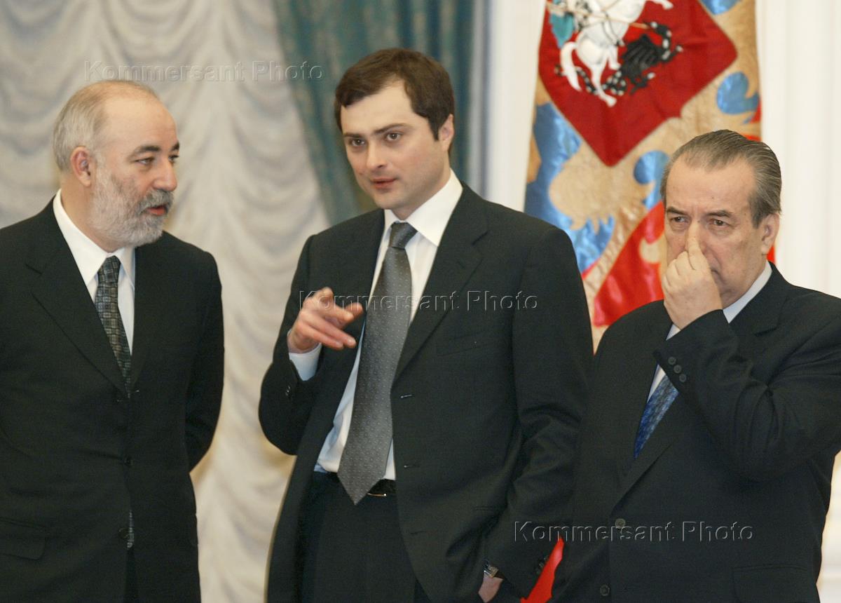 Chairman of the Renova company directors board Victor Vekselberg (left), deputy chief of the Kremlin staff Vladislav Surkov (centre), and chairman of the Russian Industrialists and Entrepreneurs Association (RSPP) Arcady Volsky (right) wait for the beginning of Russian President Vladimir Putin's meeting with RSPP leaders. The meeting was held in the Kremlin.