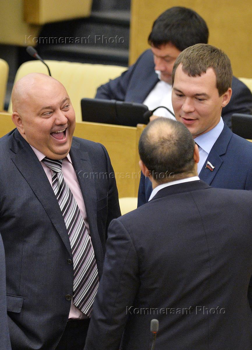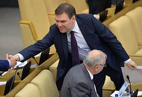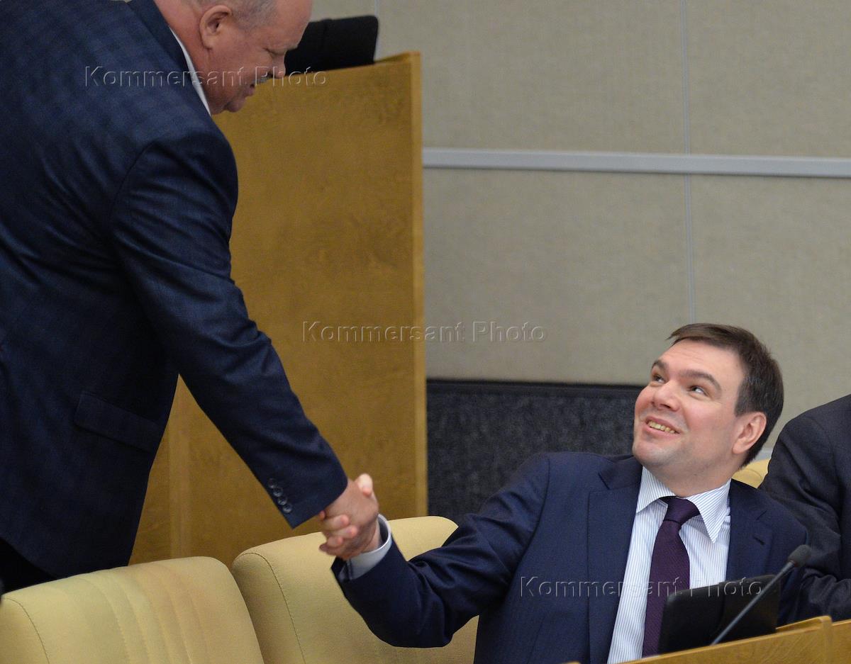 Член комитета Государственной думы (ГД) России по безопасности и противодействию коррупции Сергей Маринин (слева) и заместитель председателя комитета ГД по науке и наукоемким технологиям Михаил Дегтярев (справа) на пленарном заседании Госдумы.
