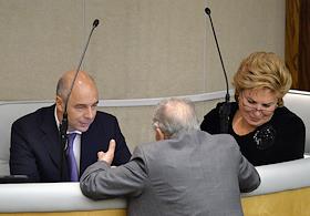 Министр финансов России Антон Силуанов (слева) и его первый заместитель Татьяна Нестеренко (справа) на заседании Государственной думы России.