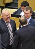 Первый заместитель председателя комитета Государственной думы России по информационной политике, информационным технологиям и связи Леонид Левин (справа) на пленарном заседании Госдумы.