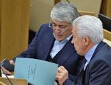 Член комитета Государственной думы (ГД) России по гражданскому, уголовному, арбитражному и процессуальному законодательству Отари Аршба (слева) и заместитель председателя ГД России, член комитета ГД по безопасности и противодействию коррупции Владимир Васильев (справа) на пленарном заседании Госдумы.