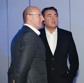 Торжественная церемония вручения третьей ежегодной премии за наиболее значимые достижения соотечетвенников "Сделано в России", организованная журналом "Сноб". Генеральный директор телекомпании "Первый канал" Константин Эрнст (слева) и президент компании "Живи" Николай Усков (справа) в конгресс-парке гостиницы "Украина".