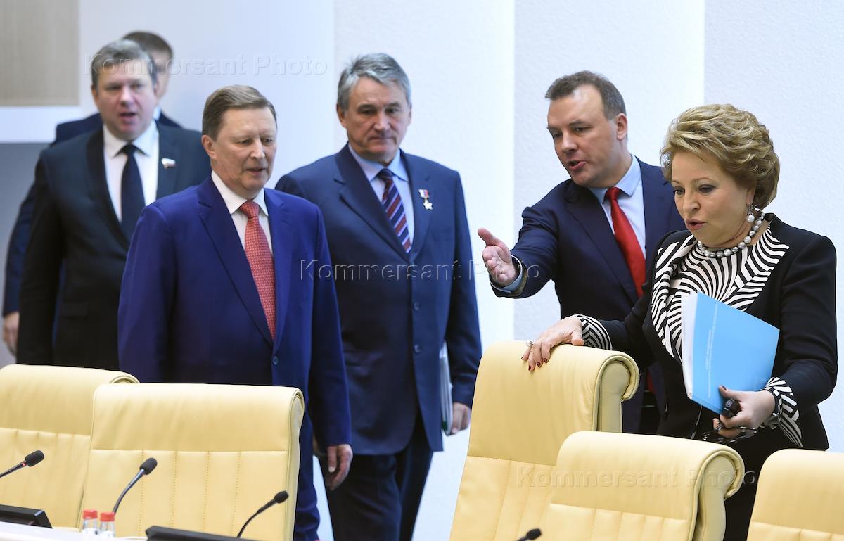 Председатель Совета Федерации России Валентина Матвиенко (вторая справа), ее заместители Ильяс Умаханов (слева), Александр Торшин (второй слева) и руководитель администрации президента России Сергей Иванов (справа) на пленарном заседании Совета Федерации России.