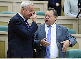 Представитель в Совете Федерации (СФ) России от исполнительного органа государственной власти Краснодарского края Виталий Игнатенко (слева) и представитель в СФ России от исполнительного органа государственной власти Камчатского края Борис Невзоров (справа) на пленарном заседании СФ России.