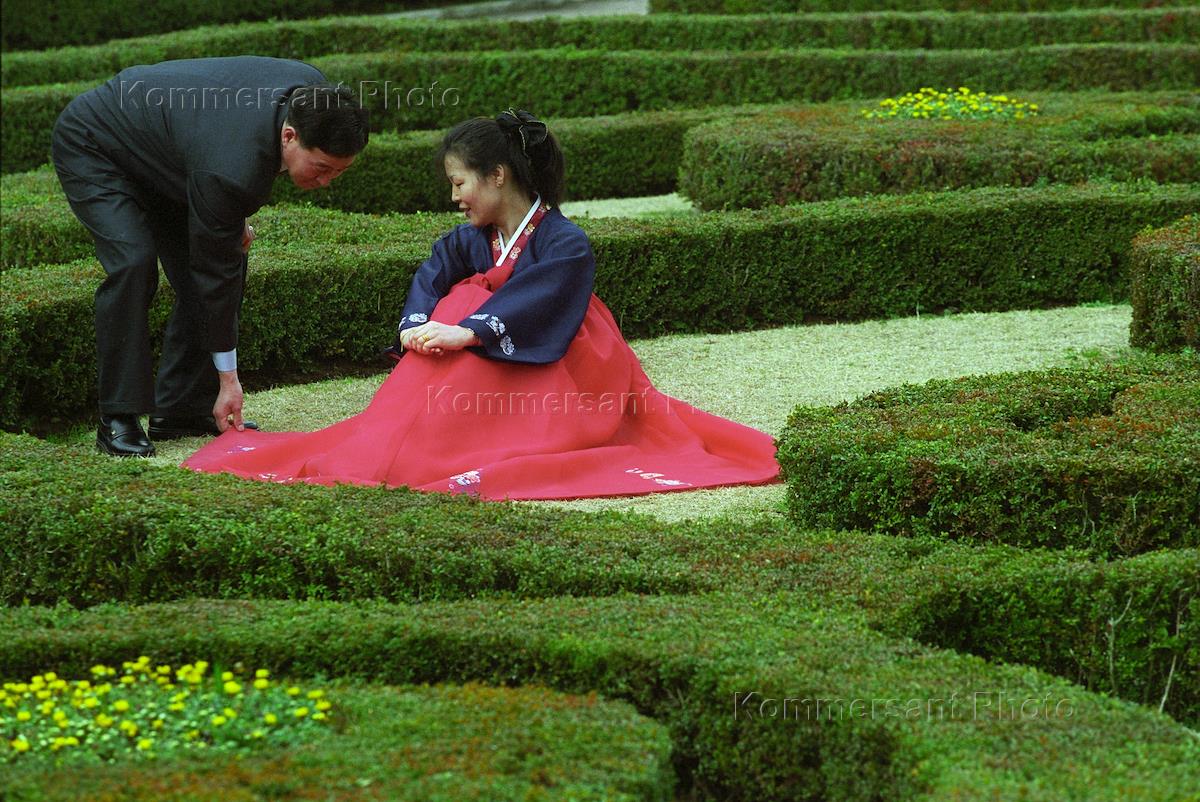 Жанровая фотография. Мужчина поправляет платье девушке в национальном корейском наряде в парке.