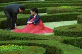 Жанровая фотография. Мужчина поправляет платье девушке в национальном корейском наряде в парке.