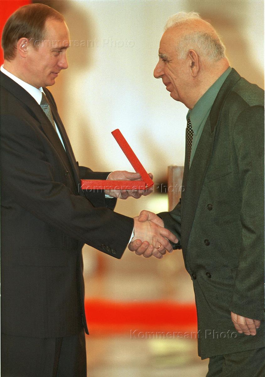Acting President and prime minister Vladimir Putin (left) hands the State awards in science for 1999 year. The ceremony was held in the Big Kremlin palace.