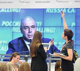 Шестой ежегодный Инвестиционный форум ВТБ Капитал "Россия зовет!" прошел в Центре международной торговлия (ЦМТ). Министр финансов России Антон Силуанов во время форума.