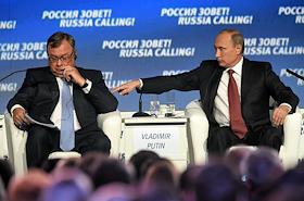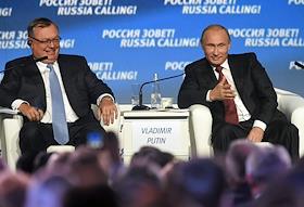 Шестой ежегодный Инвестиционный форум ВТБ Капитал "Россия зовет!". Президент, председатель правления "ВТБ Банк" Андрей Костин (слева) и президент России Владимир Путин (справа) на заседании форума в Центре международной торговли (ЦМТ).