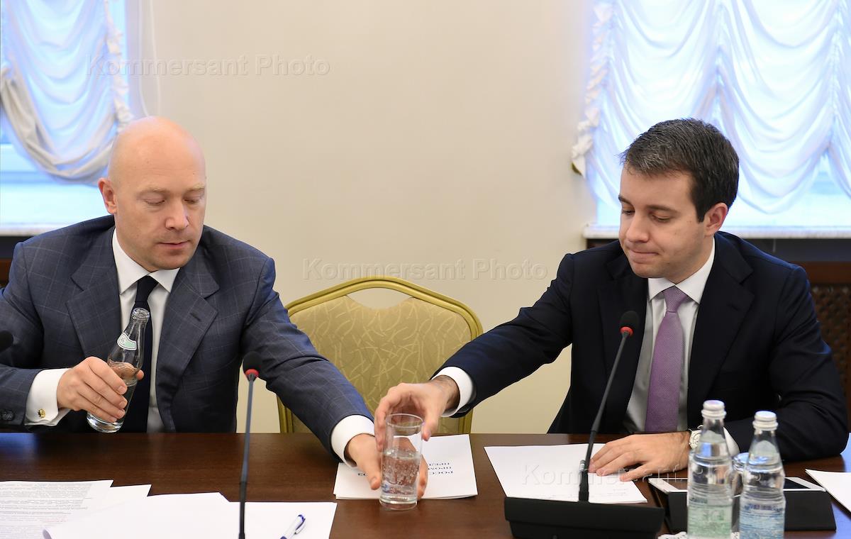Президент компании "ТрансТелеКом" Артем Кудрявцев (слева) и министр связи и массовых коммуникаций России Николай Никифоров (справа) на первом заседании комиссии Российского союза промышленников и предпринимателей (РСПП) по телекоммуникациям и информационным технологиям. Заседание прошло в РСПП.
