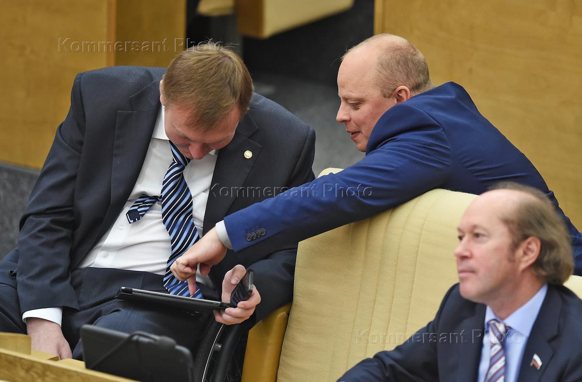 Заместитель председателя комитета Государственной думы (ГД) России по науке и наукоемким технологиям Михаил Дегтярев (слева) на пленарном заседании Госдумы России.