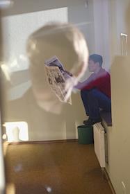 Молодой человек курит и читает газету, сидя на подоконнике.
