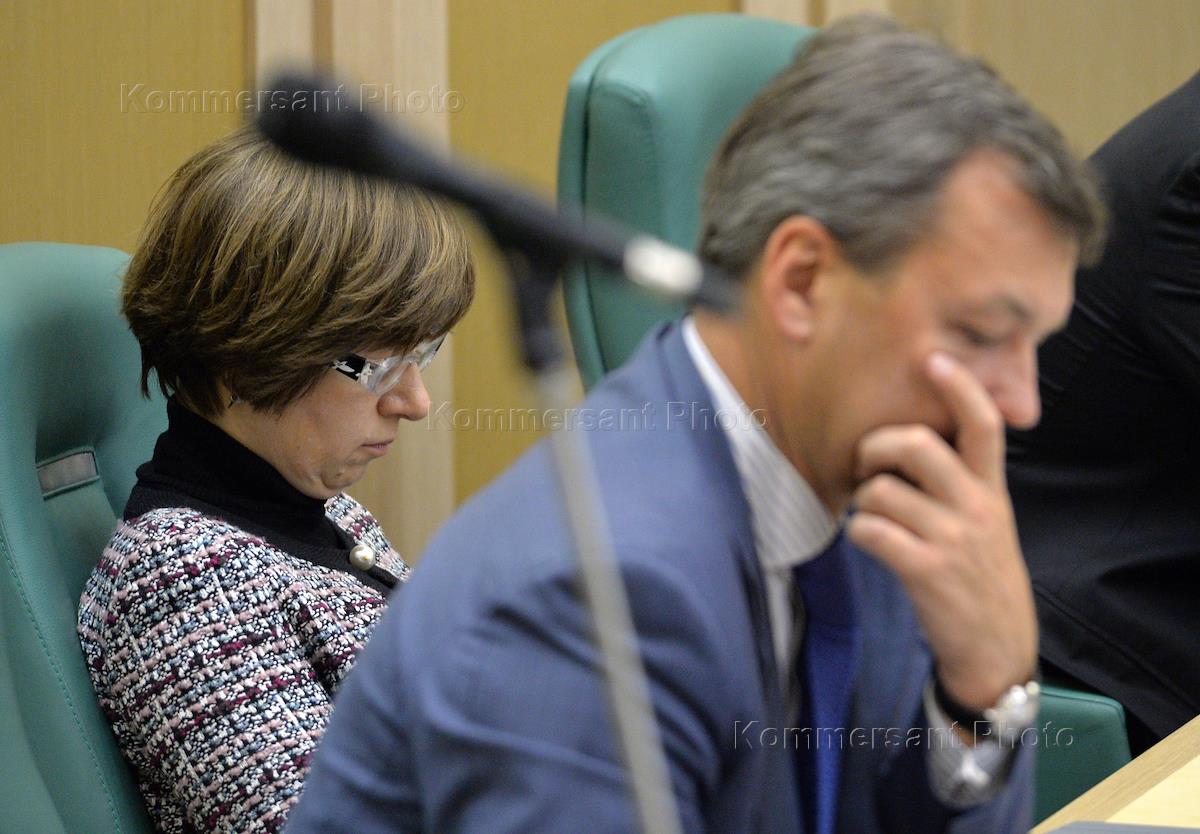 Председатель Счетной палаты России Татьяна Голикова (слева) и заместитель председателя Совета Федерации России Евгений Бушмин (справа) на парламентских слушаниях "О прогнозе социально-экономического развития РФ до 2017 года и параметрах проекта федерального бюджета на 2015 год". Слушания прошли в зале пленарных заседаний Совета Федерации России.