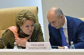 Председатель Совета Федерации России Валентина Матвиенко (слева) и министр финансов России Антон Силуанов (справа) на парламентских слушаниях "О прогнозе социально-экономического развития РФ до 2017 года и параметрах проекта федерального бюджета на 2015 год". Слушания прошли в зале пленарных заседаний Совета Федерации России.