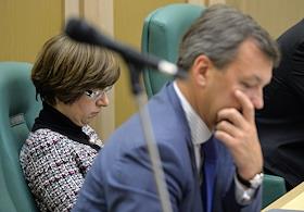 Председатель Счетной палаты России Татьяна Голикова (слева) и заместитель председателя Совета Федерации России Евгений Бушмин (справа) на парламентских слушаниях "О прогнозе социально-экономического развития РФ до 2017 года и параметрах проекта федерального бюджета на 2015 год". Слушания прошли в зале пленарных заседаний Совета Федерации России.