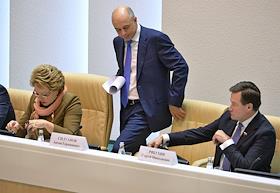 Слева направо: Председатель Совета Федерации России Валентина Матвиенко, министр финансов России Антон Силуанов и представитель в Совете федерации России от законодательного (представительного) органа государственной власти Ульяновской области Сергей Рябухин на парламентских слушаниях "О прогнозе социально-экономического развития РФ до 2017 года и параметрах проекта федерального бюджета на 2015 год". Слушания прошли в зале пленарных заседаний Совета Федерации России.