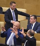 Член комитета Государственной думы (ГД) России по делам общественных объединений и религиозных организаций Виталий Золочевский (второй слева), член комитета ГД России по вопросам собственности Андрей Свинцов (второй справа) и председатель комитета ГД России по делам общественных объединений и религиозных организаций Ярослав Нилов (справа) на пленарном заседании Госдумы России.
