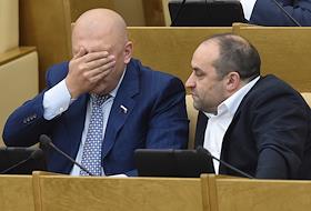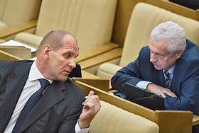 Член комитета Государственной думы (ГД) России по международным делам Александр Карелин (слева) и член комитета ГД России по безопасности и противодействию коррупции Николай Ковалев (справа) на пленарном заседании Госдумы России.