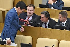 Член комитета Государственной думы (ГД) России по делам общественных объединений и религиозных организаций Виталий Золочевский (второй слева), член комитета ГД России по вопросам собственности Андрей Свинцов (второй справа) и председатель комитета ГД России по делам общественных объединений и религиозных организаций Ярослав Нилов (справа) на пленарном заседании Госдумы России.