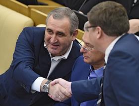 Заместитель председателя Государственной думы (ГД) России, член комитета ГД по жилищной политике и жилищно-коммунальному хозяйству Сергей Неверов (слева) и член комитета ГД по Регламенту и организации работы Государственной думы России Николай Булаев (в центре) на пленарном заседании Госдумы России.