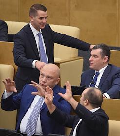 Пленарное заседание Госдумы России. Слева направо: член комитета Государственной думы (ГД) России по вопросам собственности Андрей Свинцов, председатель комитета ГД России по делам общественных объединений и религиозных организаций Ярослав Нилов, заместитель председателя комитета ГД по безопасности и противодействию коррупции Андрей Луговой, первый заместитель председателя комитета ГД России по информационной политике, информационным технологиям и связи Вадим Деньгин и председатель комитета ГД по делам Содружества Независимых Государств и связям с соотечественниками Леонид Слуцкий на заседании.