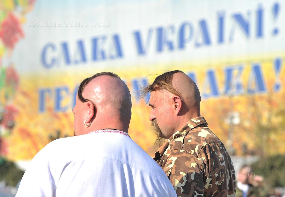 Виды Киева. Молодые люди с флагом и символикой добровольческого вооруженного формирования "Азов".