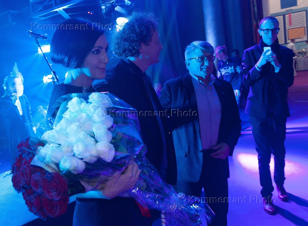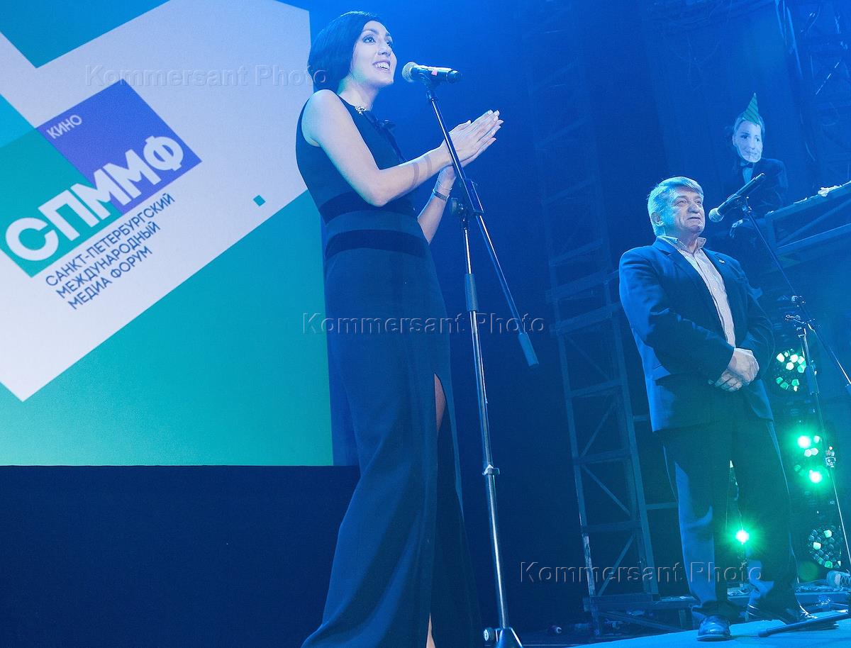 I Санкт-Петербургский международный медиа форум (СПММФ) прошел в здании Биржи. Глава "Роскино" Екатерина Мцитуридзе (слева) и режиссер Александр Сокуров (справа) во время церемонии закрытия медиа форума.