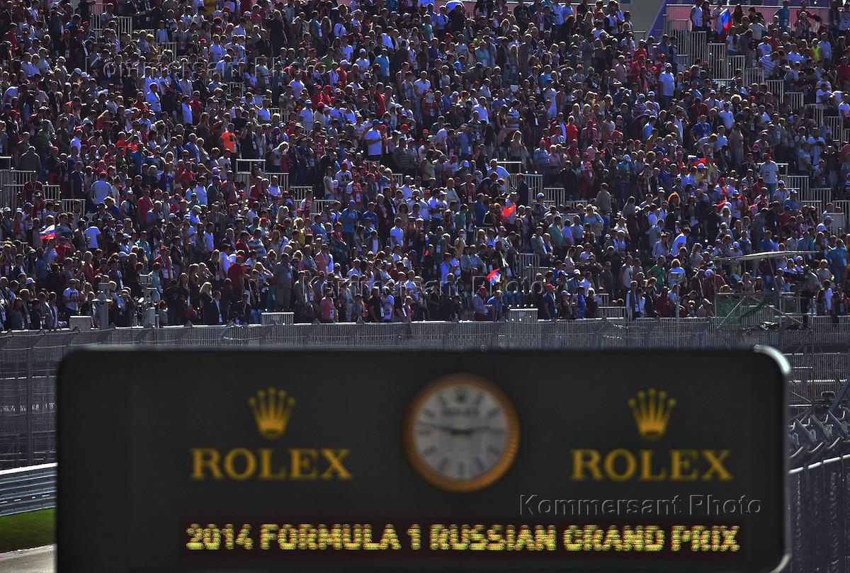 Гран-при России "Формулы-1" в Сочи. Зрители на трибуне во время российского этапа чемпионата мира по кольцевым автогонкам в классе "Формула-1".