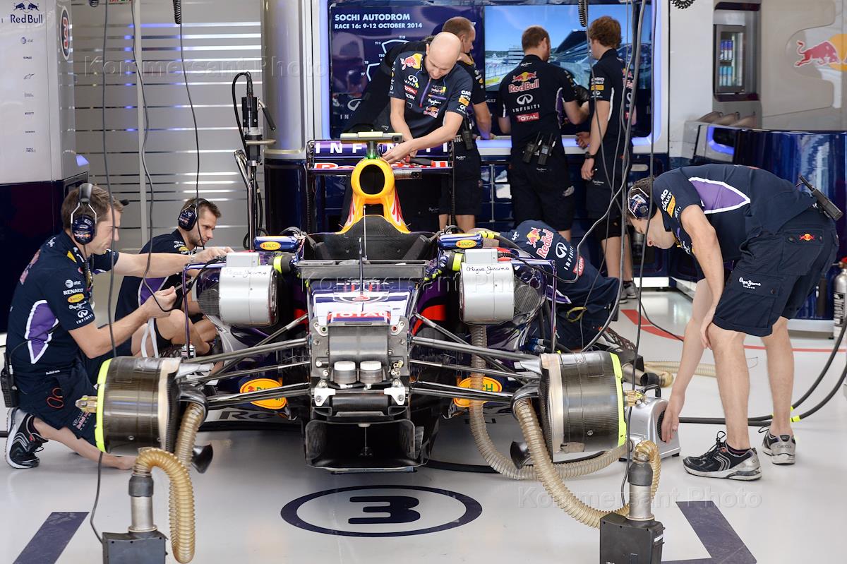 Гран-при России "Формулы-1" в Сочи. Механики команды "Ред Булл Рейсинг" в паддоке перед началом свободных заездов на российском этапе чемпионата мира по кольцевым автогонкам в классе "Формула-1".