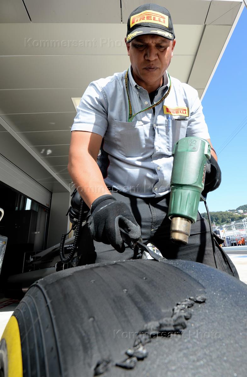 Гран-при России "Формулы-1" в Сочи. Сотрудник фирмы "Пирелли" проверяет шины колес болидов после свободных заездов на российском этапе чемпионата мира по кольцевым автогонкам в классе "Формула-1".
