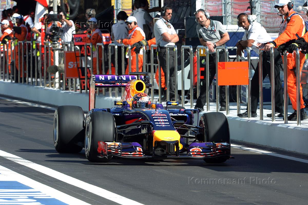 Гран-при России "Формулы-1" в Сочи. Гонщик команды "Ред Булл Рейсинг" Себастьян Феттель во время пит-стопа в свободных заездах на российском этапе чемпионата мира по кольцевым автогонкам в классе "Формула-1".