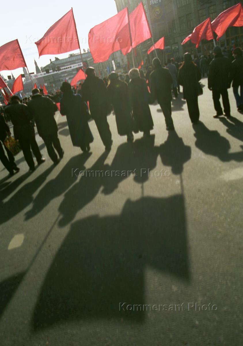 Участники шествия, посвященного Дню защитника отечества, несут портрет Сталина и красные флаги.