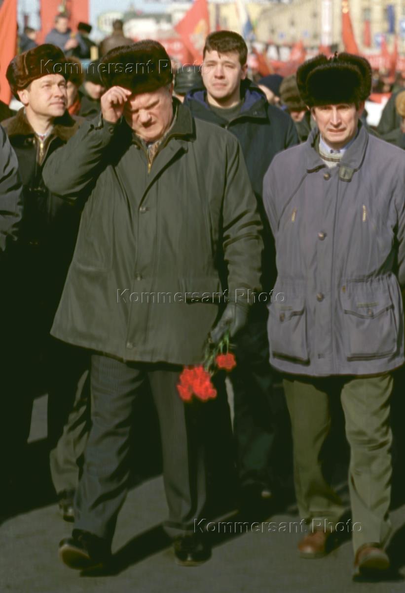 Лидер Коммунистической партии России (КПРФ), член Совета Государственной Думы России Геннадий Зюганов (слева) и депутат Государственной Думы, председатель подкомитета по уголовному, уголовно-процессуальному законодательству Виктор Илюхин (справа) на митинге, посвященном Дню защитника отечества, на Пушкинской площади.