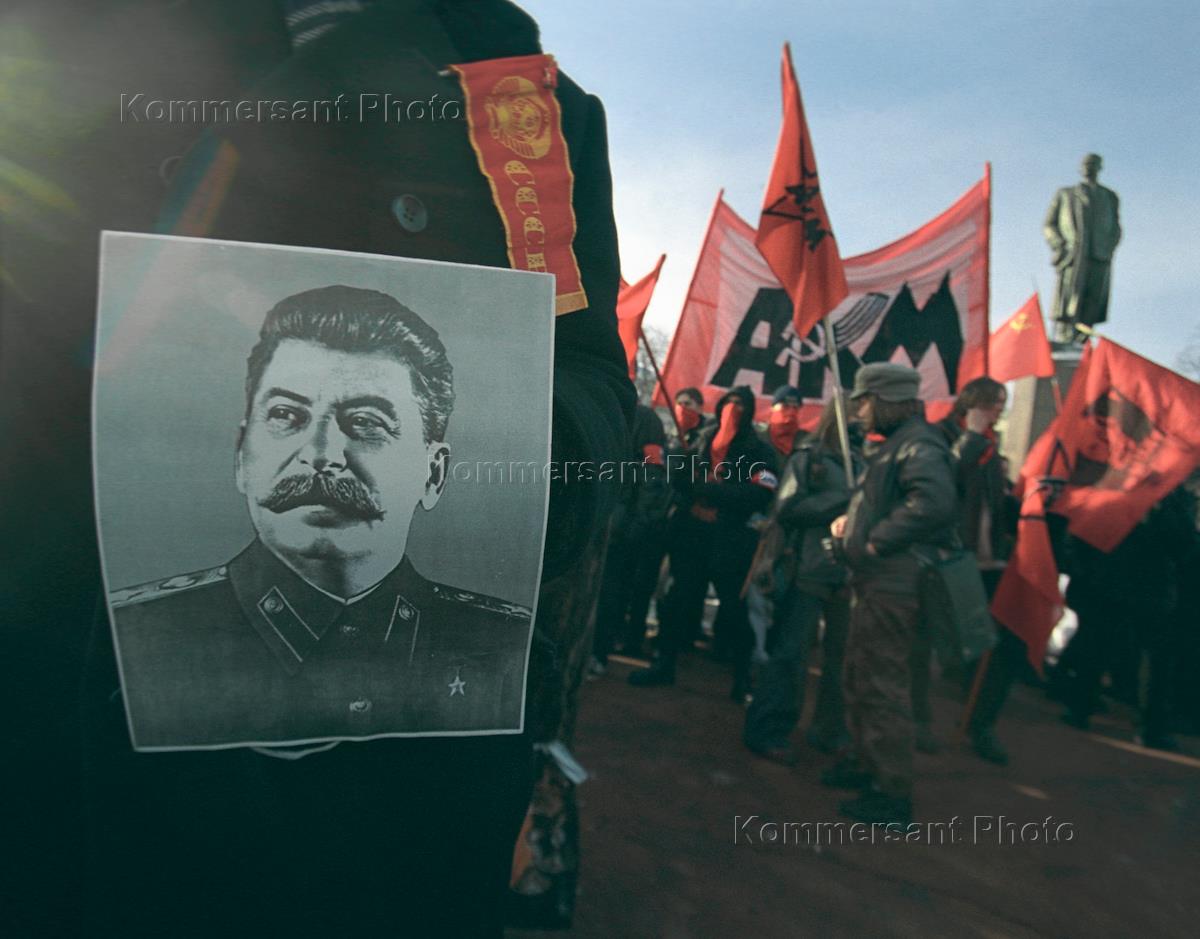 Участники шествия, посвященного Дню защитника отечества, несут портрет Сталина и красные флаги.