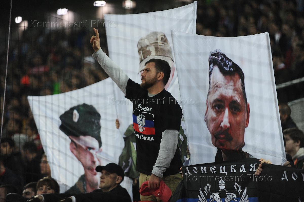 Отборочный матч Чемпионата Европы по футболу 2016. Матч между национальными сборными командами России и Молдовы прошел на стадионе "Открытие Арена". Болельщики сборной России с портретами лидеров ДНР и ЛНР с подписью: "Гордость нации".