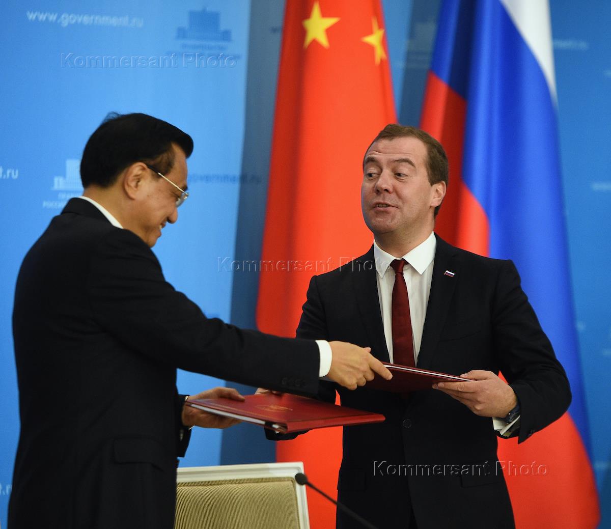 Премьер Государственного совета КНР Ли Кэцян (слева) и председатель правительства России Дмитрий Медведев (справа) на церемонии подписания документов по итогам встречи в Доме правительства России.