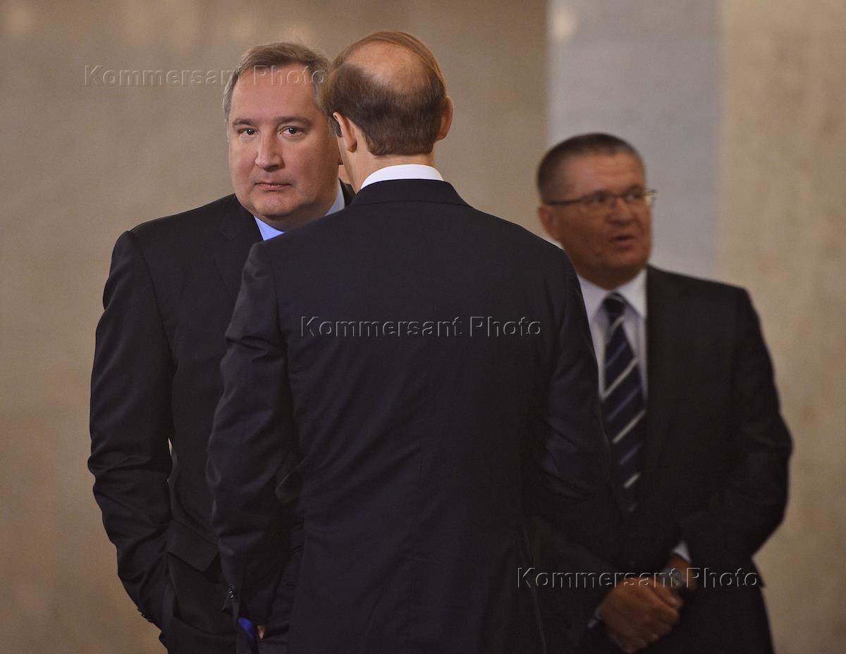 Российско-Китайские переговоры. Слева направо: заместитель председателя правительства России Дмитрий Рогозин, министр промышленности и торговли России Денис Мантуров и министр экономического развития России Алексей Улюкаев перед официальной встречей председателя правительства России Дмитрия Медведева с премьером Государственного совета КНР Ли Кэцяном в Доме правительства России.