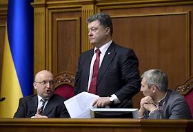 Спикер Верховной Рады Украины Александр Турчинов (слева) и президент Украины Петр Порошенко (в центре) на заседании Верховной Рады Украины.