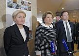 Заседание организационного комитета по проведению в России Года культуры прошло в здании министерства культуры России. Слева направо: заместитель председателя правительства России Ольга Голодец, председатель Совета Федерации России Валентина Матвиенко и министр культуры России Владимир Мединский отвечают на вопросы журналистов после засдеания.