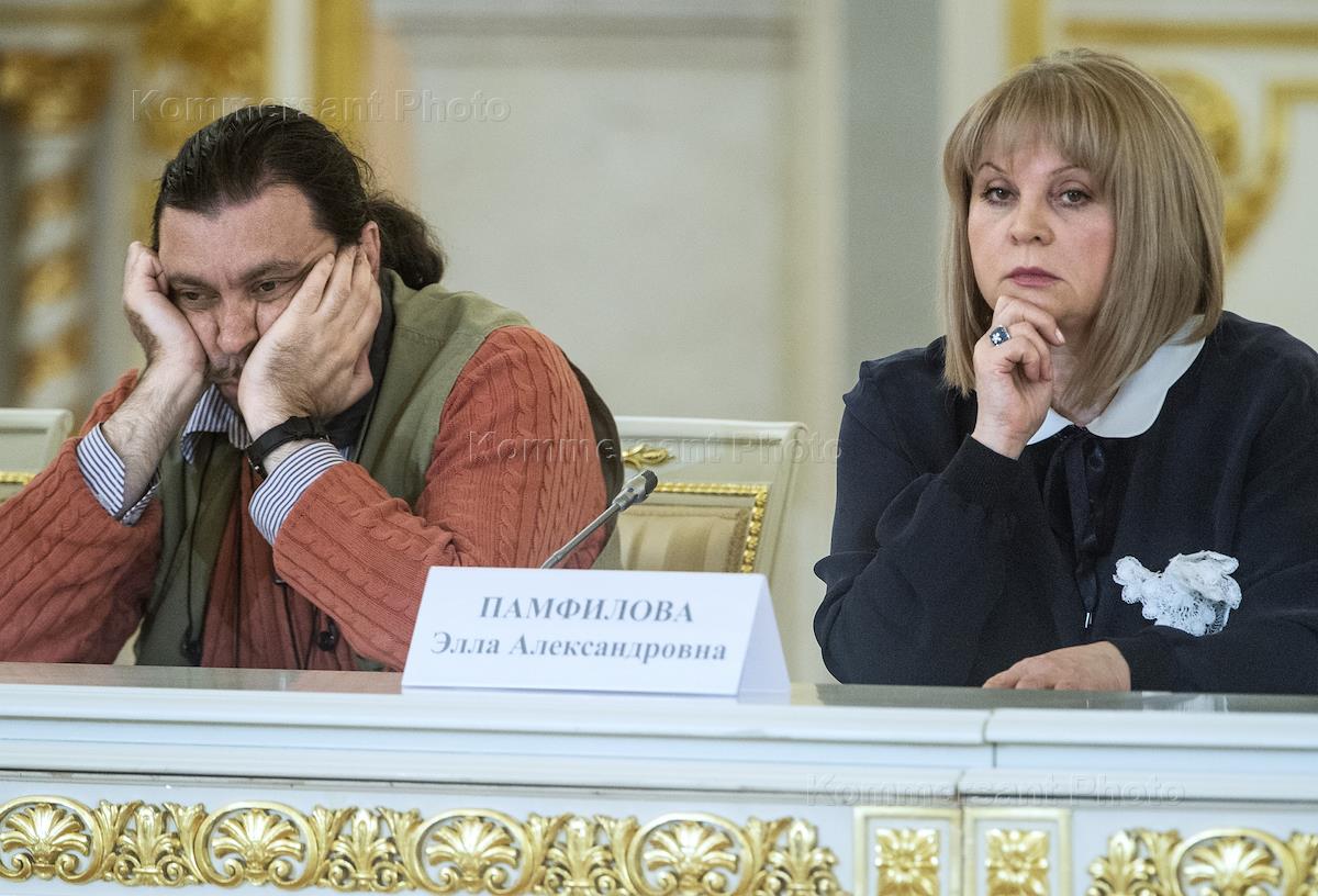 Президент благотворительного фонда "Интернациональный проект – Молодёжное правозащитное движение" Андрей Юров (слева) и полномоченный по правам человека в России Элла Памфилова (справа) во время заседания Совета при президенте России по развитию гражданского общества и правам человека. Заседание прошло в Александровском зале Большого кремлевского дворца.