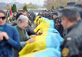 Гробы с телами неопознанных военнослужащих, погибших во время боевых действий на Донбассе, перед захоронением на Краснопольском кладбище.