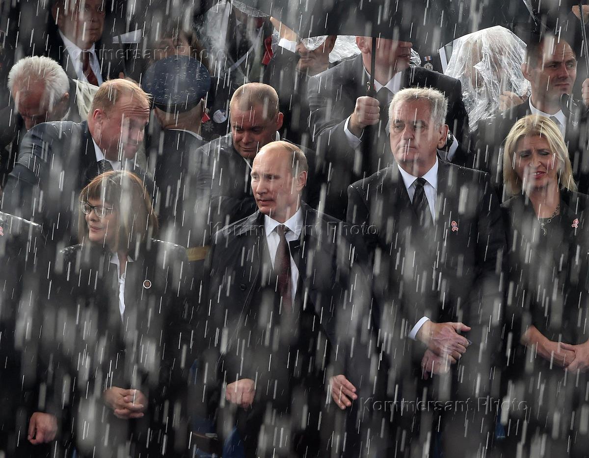 Рабочая поездка президента России Владимира Путина в Сербию. Президент России Владимир Путин (в центре) и президент Сербии Томислав Николич (второй справа) на военном параде "Шаг победителя", посвященном 70-летию освобождения Белграда от немецко-фашистских захватчиков.