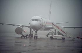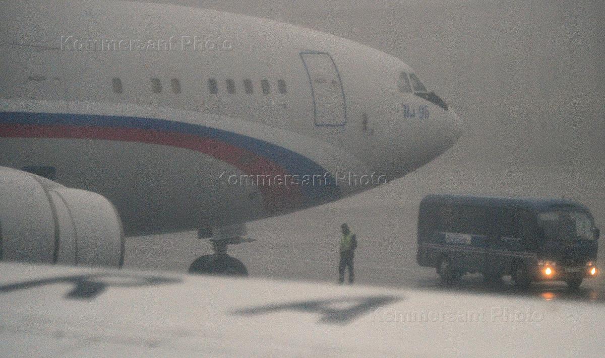 Туман во Внуково-2. Самолет на взлетной полосе.