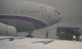 Туман во Внуково-2. Машина у самолета на взлетной полосе.